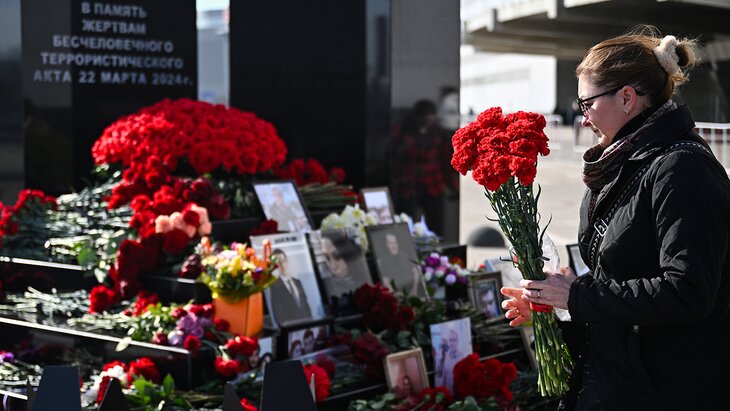 Москвичи несут цветы к мемориалу в память о жертвах теракта в "Крокусе"